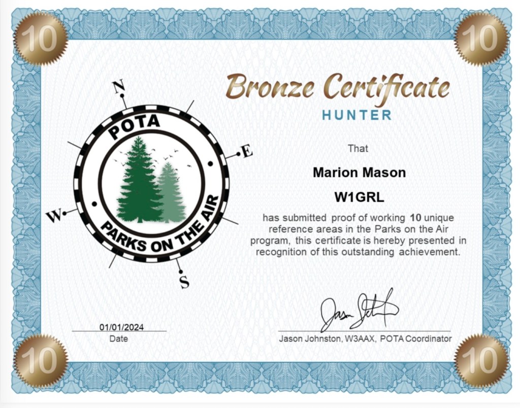 Marion W1GRL shared that she hunts POTAs often, but hasn’t completed many activations. Her goal is “to keep up with W1BOY’s activations and use CW for POTA QSOs.”