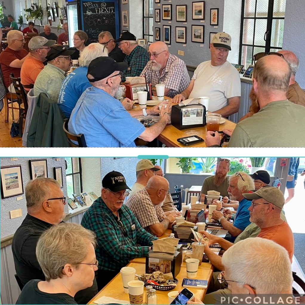 The conversations vary as much as the interests and time spent in the ham radio hobby. Around the table there are several who are new to ham radio and others who have been operating a radio for decades. Mentoring happens naturally. As the morning progresses, it’s common for folks to move to different chairs to join in new conversations and catch up with friends. People arrive and depart as they wish, with the last ones usually staying after 11am. This week I heard folks talking about antennas, which radios are best for Field Day, new DX contacts, the upcoming HamXposition, vanity call signs, and packet radio. Clandestine Coffee mornings at Flexit in the summer are just what they should be … the ham radio community coming together for good coffee, food and conversation. Perhaps we will see you there some time!