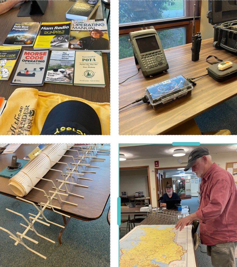 The next group started with Barbara KC1SSY who brought many books to loan as well as a kit to build an AM/FM superset radio. Ian KC1SCB shared a clever set of 2 BaoFeng radios in a box. The radios were placed so that the output from one speaker would be taken in by the other microphone, thus producing a cross band repeater. He also demonstrated a directional antenna that would be great for radio fox hunting and determining the source of radio interference. Jack W1IU shared a 70cm version of a home-brew antenna based on one found in the 2010 version of the ARRL Antenna Designer’s Notebook. He also brought some old Russian radio maps for anyone to take.