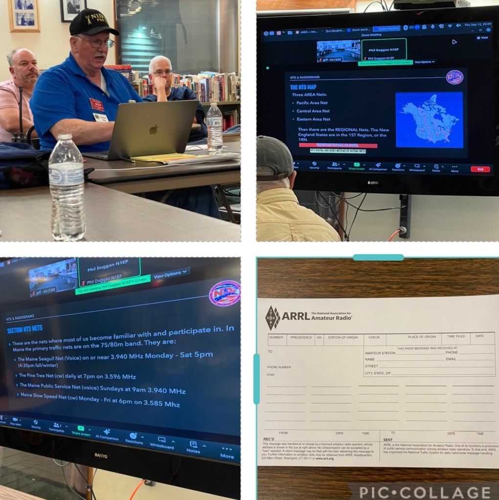 Following the business meeting and an intermission for some sweet treats (thanks Bernie KI4VCR), Phil N1EP gave a presentation on the National Traffic System and Radiograms. He shared some of the history of the program and the new NTS 2.0. (See https://www.arrl.org/nts/ and https://nts2.arrl.org/ for more information.) Within the NTS system we are in the Eastern Area Net, and more specifically 1RN or the 1st region. Phil provided details for the primary Maine Nets: Maine Seagull Net (voice), Pine Tree Net (cw), Maine Public Service Net (voice), and Maine Slow Speed Net (cw). Time and frequencies for these are in a photo below. The heart of Phil’s presentation centered around how to record a message (traffic) on the ARRL Radiogram form. He concluded with several funny examples to make some key points.
