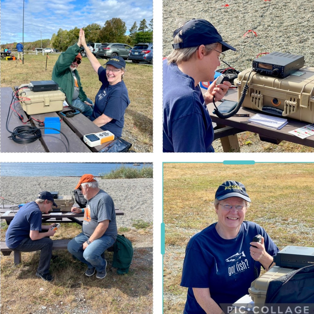 On Friday morning, Sept 27, a group of ten EAWA members and friends gathered at Lamoine State Park for some shared Parks on the Air activations. There were three active stations operated primarily by Dick W1KRP, Barbara KC1SSSY, and Greg KC1RID. Marion W1GRL completed her activation using Greg’s station. Station 1 used Dick’s Xiegu G90 and home brew wire antenna, Station 2 employed Barbara’s Kenwood TS-50 and a Super Antenna MP1DXTR80, and Station 3 used Greg’s ICOM 7300 and a home brew linked dipole. Contacts were made as far away as deep into Europe and the western US, and as close as EAWA member W1BOY who contacted all three stations from across the bay in Bar Harbor.