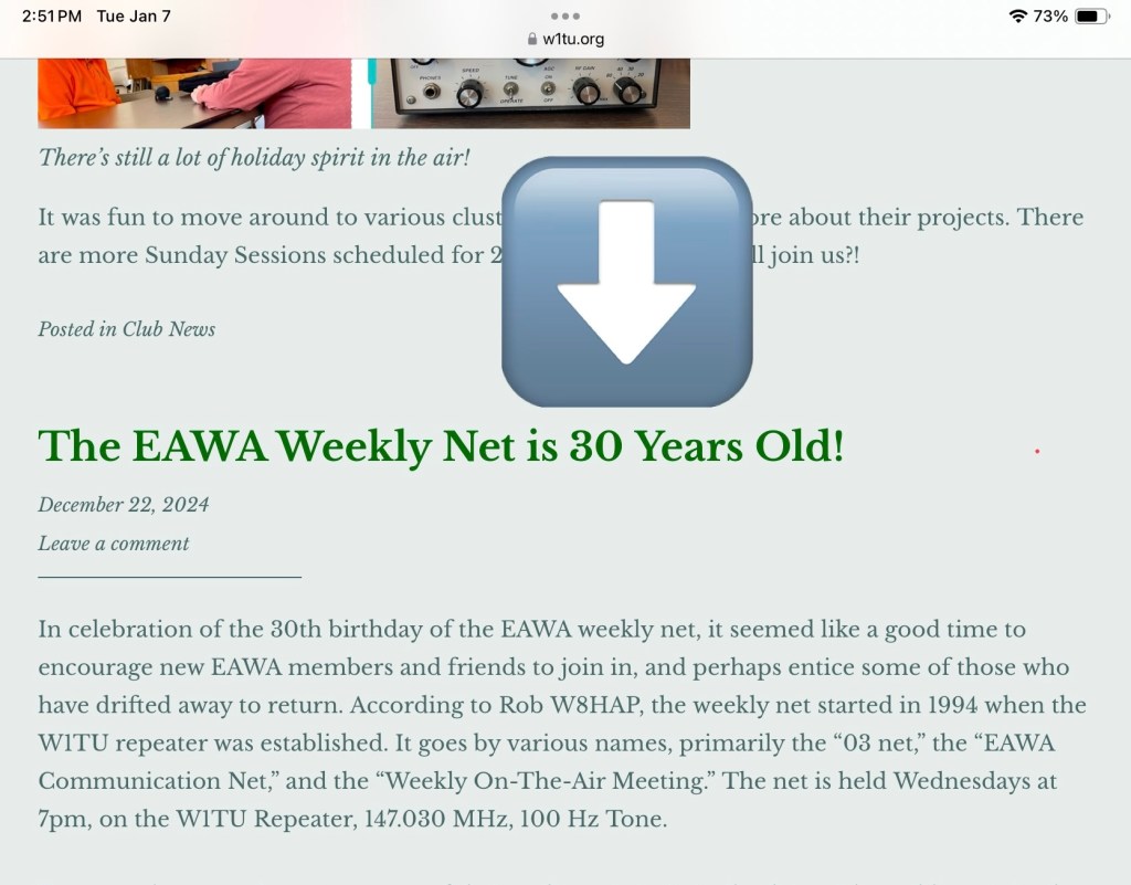 One of our goals was to make it easier to find older posts as some of them are quite good (hi hi). Seriously, some of them, such as the post on how the weekly nets are run for someone new, should be easy to find. With that in mind, we have changed the tabs at the top from Announcements and Happenings to Club News and Articles. Club News items are tied to specific club events such as monthly meetings, whereas Articles share news about particular EAWA members or more general club functions. The post on the nets is an example of items in the Articles tab. Some posts may show up in both categories.
