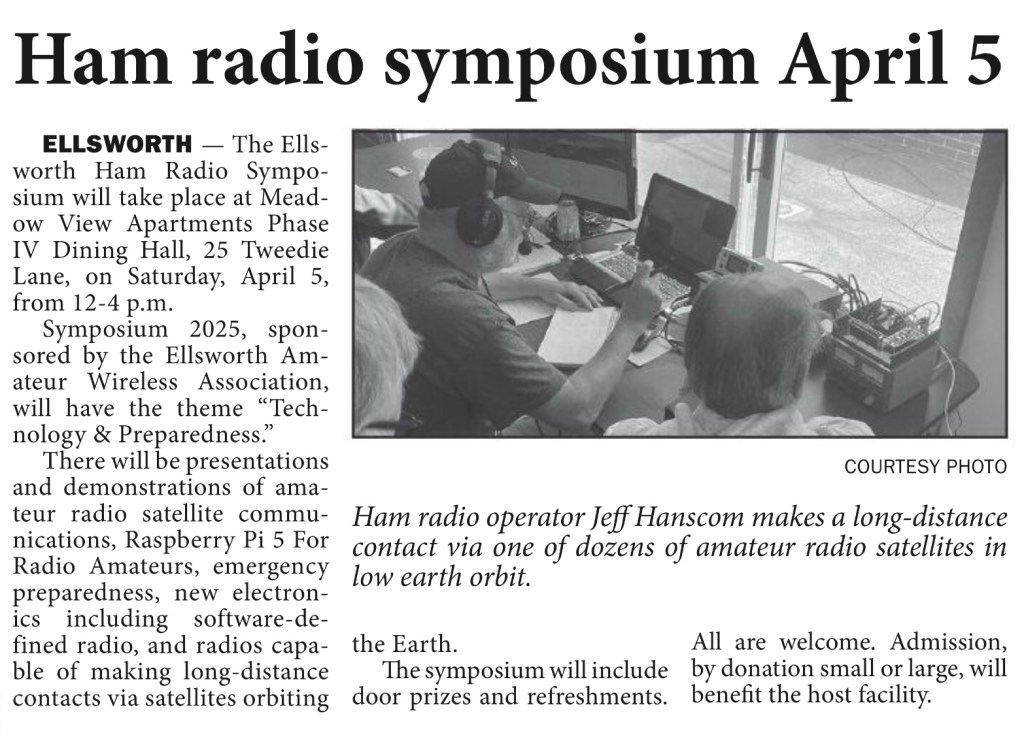 Save the date of April 5th for this year’s symposium, “Technology & Preparedness.” There will be presentations and live demonstrations of amateur radio satellite communications, Raspberry Pi 5 For Radio Amateurs, and Emergency Preparedness. Some of the featured cutting-edge technologies include software-defined radio and radios capable of making long-distance contacts via satellites orbiting the Earth. The ‘preparedness’ presentations will include some old and new techniques for dealing with a loss of commercial power, cell phone communications, or internet communications.