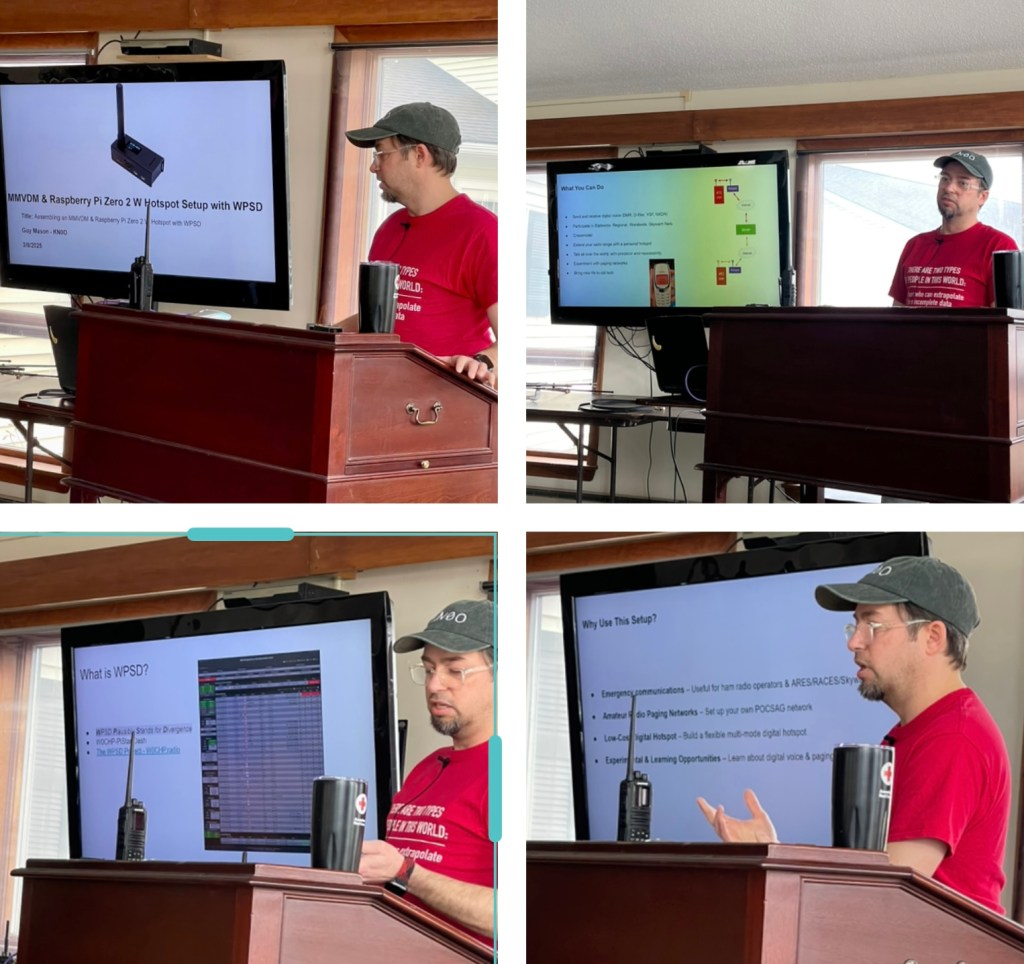 Guy KN0O gave the second presentation on Multi-Mode Digital Voice Modems (MMVDM) & Raspberry Pi Zero 2 W Hotspot Setups with WPSD. Examples of modes handled by a MMDVM include Digital Smart Technologies for Amateur Radio (D-STAR), Digital Mobile Radio (DMR), and Yaesu System Fusion (YSF). Guy gave examples of software uses for this kind of setup, such as sending and receiving digital voice, checking into nets, and extending your radio range. He then gave an informative tutorial on how to set such a system. He covered the required hardware, how to install and configure the WPSD software controls, and how to assemble the Pi Zero 2 W for this purpose. He had the hardware on site to show the details, down to the where to soldier parts together. He also demonstrated the potential for using an old pager as part of this process. He concluded by highlighting the benefits of this system: Emergency Communications, Amateur Radio Paging Networks, and Opportunities to Learn and Experiment.