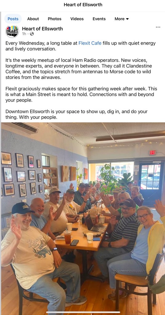What a wonderful compliment to be featured in a Facebook post from the Heart of Ellsworth, and to be hosted each week by Flexit Cafe! One of the primary functions of the radio club is to offer ways for hams to get together to discuss all things radio. We are a lively bunch!