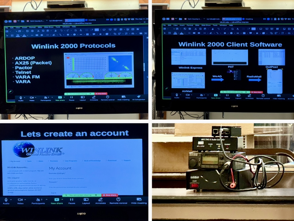 Second, after the brief business meeting, Jeff KA1DBE shared an informative presentation on Introduction to WinLink 2000. While WinLink started back in the 1980s as a way for sailors to send email to the mainland, today it’s also used extensively as a way to send data via the airwaves. It was first used widely in the immediate aftermath of Hurricane Katrina, sending data out from devastated areas. Jeff shared how WinLink has developed to support many standard templates and forms used in emergency situations. For those not familiar with the process, it resembles sending email or filling out a digital form. He also showed how easy it is to set up an account, fill out a message, and select the routing path for that message. In an emergency, when there is no internet or cell service, operators can send precise information, such as someone’s medication needs, through a portable WinLink set-up.